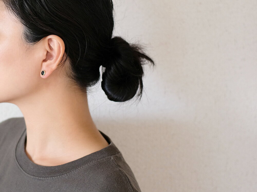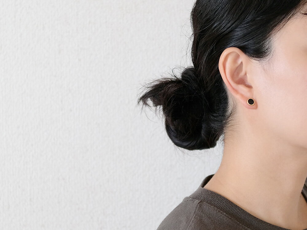 ラウンド型のシンプルなデザインにブラックオニキスをセットすることで、クールで大人しいすっきりとしたピアスに仕上げました。